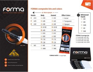 کامپوزیت فورما اولترادنت (Ultradent Forma Composite) در طیف گسترده‌ای از رنگ‌ها موجود است تا بتواند به بهترین شکل با رنگ طبیعی دندان‌های بیمار هماهنگ شود. این رنگ‌ها شامل: