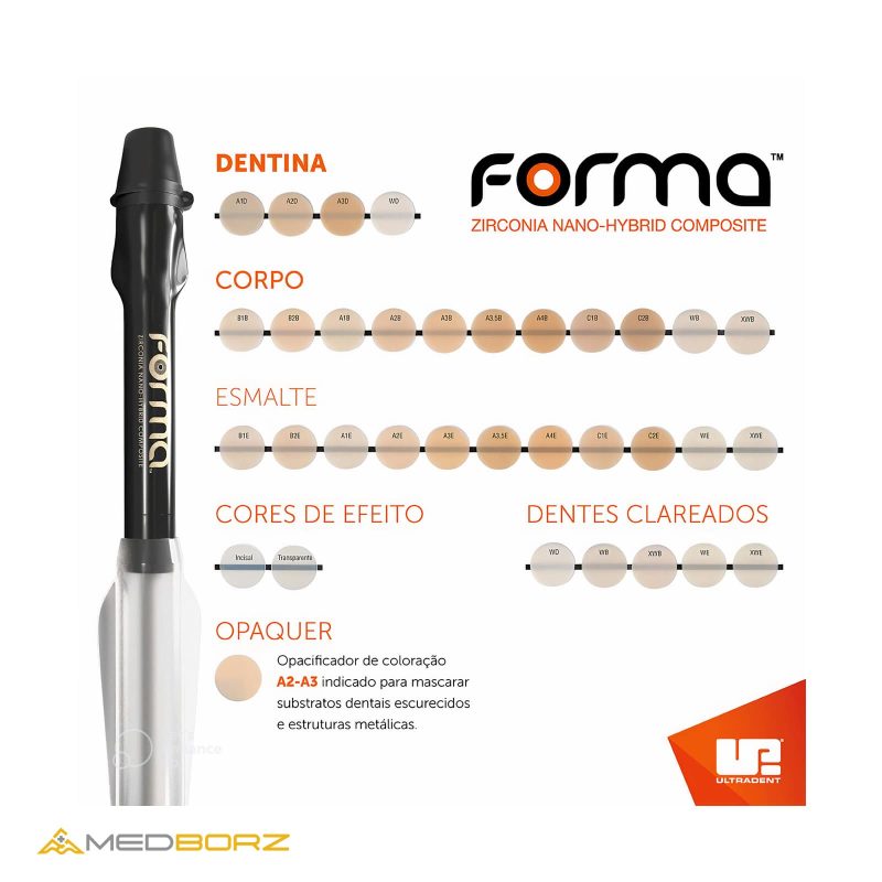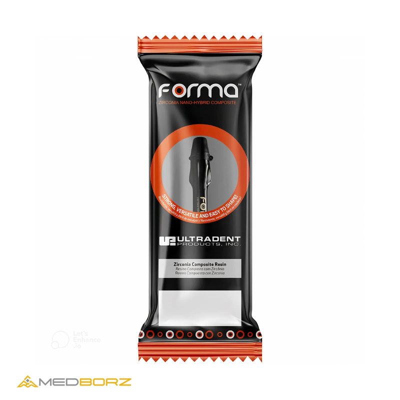 کامپوزیت فورما اولترادنت (Ultradent Forma Composite) یک رزین کامپوزیت نانوهیبریدی است که به دلیل ویژگی‌های مکانیکی عالی و زیبایی بالا، برای ترمیم‌های مستقیم دندان بسیار مناسب است. این کامپوزیت دارای ذرات زیرکونیا است که به آن استحکام و مقاومت بالایی می‌بخشد.